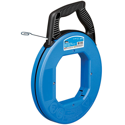 Perfect for longer conduit runs, this fish tape boasts the highest tensile strength, and highest grade carbon steel for professional durability and reliability. The Blued-Steel™ also provides rust and corrosion resistance for longer life. The Tuff-Grip™ Pro case and handle are impact resistant, while the unique design keeps the wire inside the case, even after a long fall. Multiple width, length and eyelet options are available for ease of use for any application. Replacement tapes also available.