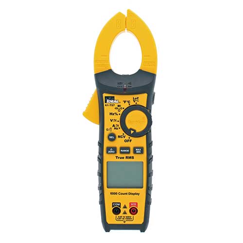 The IDEAL 61-757 TightSight™ Clamp Meter is a CAT IV 600 CAT III 1000 V rated auto ranging true root mean square (TRMS) digital clamp meter that measures up to 600 Amps AC and DC current via the clamp head. It measures up to 1000V AC and DC, Low Impedance AC Voltage (Lo Z) (to reduce the possibility of false readings due to ghost voltages) , frequency, resistance, continuity, capacitance, and diodes via test-leads (included) and measures temperature (?F/?C) via a K-Type thermocouple (included). It's capable of detecting the presence of voltage between 40V to 600V via a non-contact sensor in the right tip of the clamp. The patented TightSight LCD Display, located on the bottom of the unit, enhances safety and productivity by displaying a secondary reading at the end of the meter, eliminating the need to bend or twist conductors or place you head near the panel in order to see the main meter display. Both displays can be backlit, and a built-in flashlight can be illuminated when working in poor or zero lighting conditions. The unit uses an illuminated red LED in the center of the meter and emits audible tones to notify when voltage is above 30 volts, when continuity is detected and when the NCV senses voltage within its set range. The clamp head has a built-in probe tip holder on the backside of the right clamp to allow measurements holding the clamp in one hand and the second lead in the other hand. The meter has a hanging strap mount (compatible with all other IDEAL meters with this feature) that allows for a hanging strap (sold separately) to be attached to the meter so it can be hung from a nail, screw or magnetic surface. An industrial grade over molding enhances grip and drop protection. This meter features HOLD, MIN/MAX, Relative, Zero, Range, and selectable Auto Power Off functions. The meter comes with 3 1.5V AAA Batteries and an easy open, fully accessible storage pouch with a belt loop that allows for meter, probe and thermocouple storage.