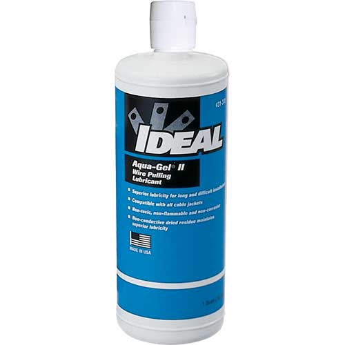 IDEAL Aqua-Gel® II Non-toxic cable pulling lubricant in clear blue colour is a polymer-based formula that offers maximum tension reduction in high-stress electrical and communications cable-pulling operations. Lubricant dries to a semi-fluid film that won't clog conduit, and cleans up easily with soap/water. It remains temperature stable over a wide temperature range from 28°F to 180°F (-2°C to 88°C). Lubricant is convenient to apply by hand, brush or pump. It is well suited with all cable types except composite rubber, and clings to cable throughout long pulls. It comes in a 1-quart squeeze bottle, 1-gallon bucket, 5-gallon bucket, and 55-gallon drum. It is environmentally safe, non-toxic, non-flammable and non-corrosive for convenient use. For outdoor use only.