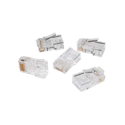 - Feed-Thru 8 position, 8 contact RJ-45 modular plug for CAT5e, 100? balanced twisted pair 100 MHz cables.